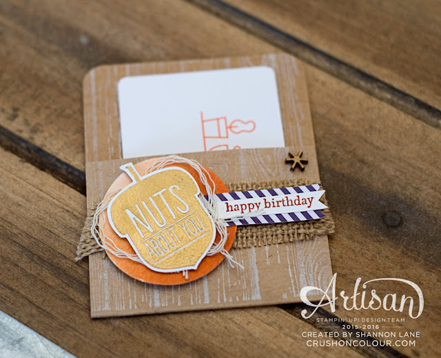 (My link generator is apparently taking the day off today - for supplies, visit my Online Stampin' Up Store by clicking the link on the right side of my blog. The stamp sets used are Hardwood, Acorny Thank You, and Teeny Tiny Wishes. Embellishments are Watercolor Paper, Burlap Ribbon, Thick Bakers' Twine in Very Vanilla, Project Life Corner Rounder punch, and the tiny wood asterisk is from the This Is The Life Project Life accessory kit. Ink colour is Cajun Craze. Thanks!)